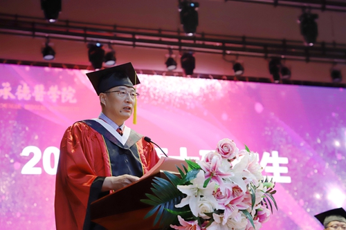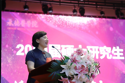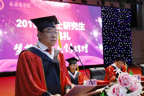 校长唐世英教授代表学校党政领导及全体教职员工向毕业研究生们表示衷心的祝贺,向勤勉尽责的老师们、向关心帮助他们成长的每一位朋友表示由衷的感谢。唐世英回顾了2019届研究生取得的丰厚的学术成果,祝贺同学们在学习与研究的交融中锤炼了品质,在学生与学者的转换中展露了风范,在创新与创业的探索中彰显了卓越,在承医的历史画册上写下了专属于2019届研究生的辉煌一页。他肯定了同学们以积极的行动为学校研究生事业发展做出的贡献,希望同学们感恩老师,感恩父母,在前行的路上可以飞得更高,飞得更稳,并嘱托毕业研究生离校后要以一种新的身份弘扬承医精神,续筑承医梦想,彰显承医担当。在惜别之际他对全体毕业研究生提出了三点殷切期望:一是胸怀家国天下,筑牢信仰之基;二是奋斗于新时代,做好强国一代;三是深悟医者初心,践行医学使命。做到砥砺梦想、拼搏实干,不负伟大时代,成就自己绚丽的医学青春。
