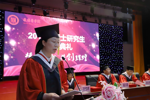 2019年6月27日上午,我校2019届硕士研究生毕业典礼暨学位授予仪式在学校会堂举行。学校党委书记盛婉玉,校长唐世英,党委副书记谢利德、张学良,副校长、附属医院院长郝长来,副校长李玉红、翟玉建、张凯出席了典礼。研究生学院全体教职工、全体毕业研究生、导师代表及在校研究生参加了此次典礼。典礼由研究生学院院长王瑞婷主持。