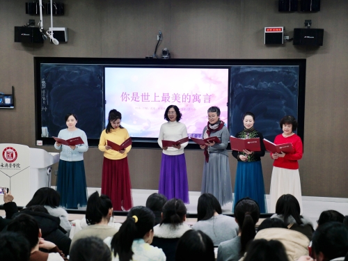 诗歌朗诵《你是世上最美的寓言》将活动推向高潮。6位女教师声情并茂的演绎,深刻诠释了女性如露珠般纯净、如大地般包容的伟大形象,赞美了女性在生命传承、社会发展中所展现的无私奉献与坚韧力量。朗诵时而温婉深情,时而激昂澎湃,引发了在场观众的强烈共鸣,赢得了阵阵掌声。